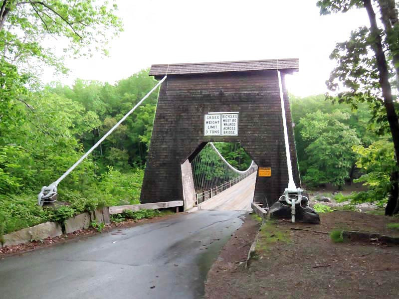 The construction history of the bridge is a matter of minor local controversy. One traditional account places its construction at 1840-42, under the auspices of Colonel F. B. Morse, who lived nearby and had been an engineer in the army. According to this account, Morse ordered the cables from Sheffield, England, and had them hauled overland from Hallowell by a large team of oxen. Local criticism of the work led the bridge to be dubbed "Morse's Fool Bridge". The official town history of the bridge is more prosaic, stating that it was built in 1864-66 by David Eider and Captain Charles Clark. The bridge was last rehabilitated in 2009-10; its towers and cables are original.