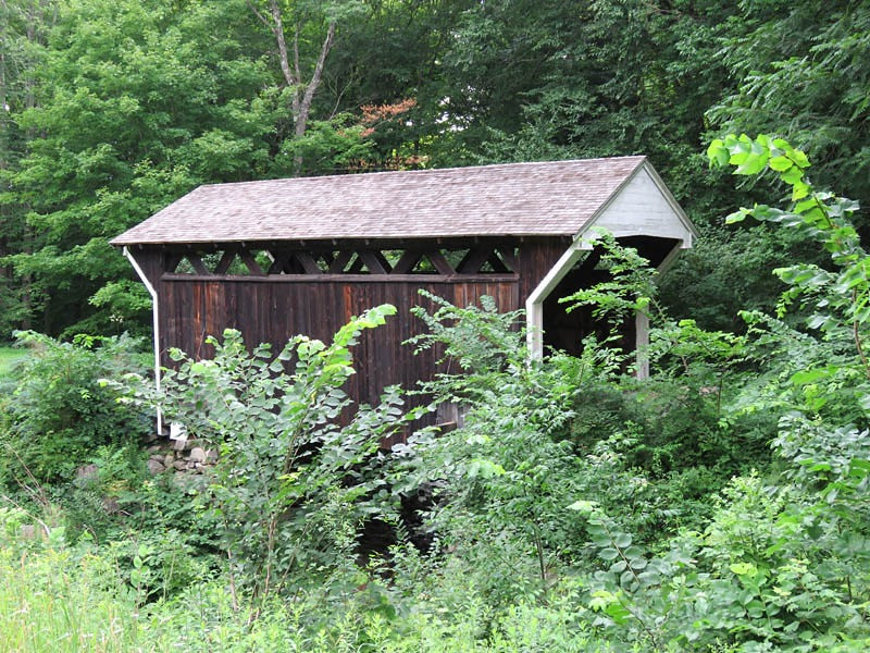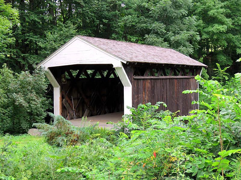 Bridges are known to have stood on the site since ca. 1794, when the town appropriated funds to build a bridge near the mill of Messers Jabez Rockwell and John Prentiss. At 36 feet in length, it is the shortest 19th-century covered bridge built for use on a public roadway in New Hampshire that is still standing. The lattice timbers are held together by Trinnalsor (tree-nails).