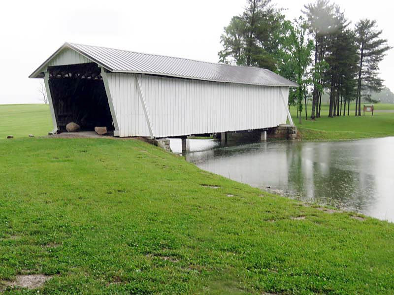 The R.F. Baker Covered Bridge, also known as the Winegardner Bridge, is an 80-foot-long Multi-Kingpost through truss that was built in 1871 by James Arnold to span Little Rush Creek at Drum Bottom Road near Winegardner Mill. Rush Creek Lake inundated its original location, and the bridge had to be rescued. It was removed and reconstructed over a small lake on the grounds of Fairfield Union High School in 1981 and has since been used as a special student project to protect it. The bridge, now halfway through its second century of use, is open to pedestrian traffic only, sitting peacefully behind the school facilities.
