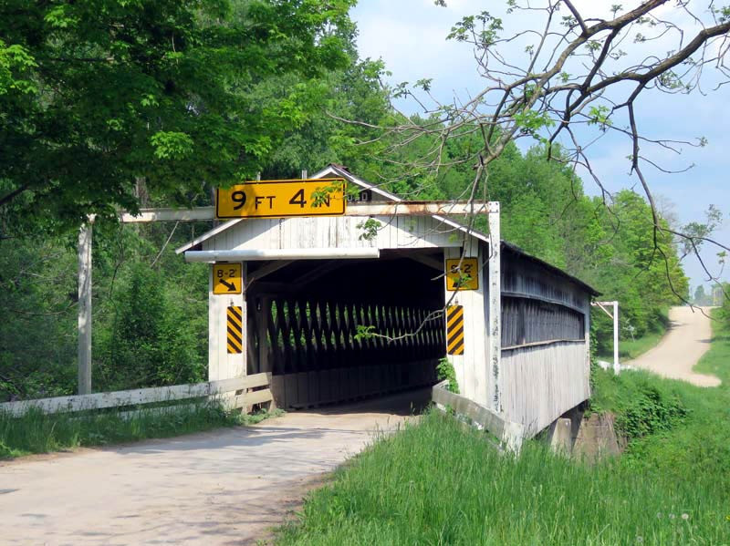 Dimensions of this two-span covered bridge over the West Branch Ashtabula River on Root Road: Length of largest span: 40 feet; Length of bridge: 89 feet; Width: 11.3 feet; Height: 10 feet 2 inches; Overhead clearance: 9 feet 4 inches.