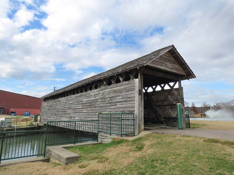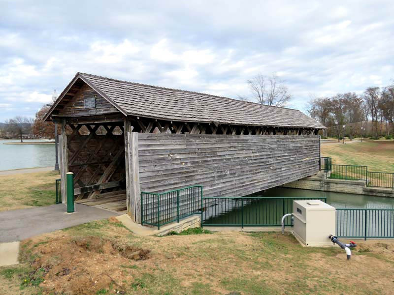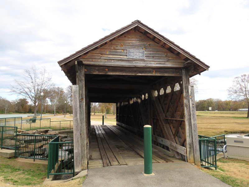 The Coldwater Covered Bridge was built by a former slave around 1850 (although some sources say it was built as early as 1839), originally located over Coldwater Creek. Nearby was Coldwater Mill, also known as Hughes Mill, a local saw and lumber mill owned by Peter N. Hughes and Humphrey Hughes. The bridge partially burned in the early morning hours of August 11, 1920, but was able to be repaired and remain open to motor vehicle traffic. A concrete and steel bridge eventually replaced the aging Coldwater Covered Bridge in 1974, which was soon left to temporarily survive the elements. In 1990, the bridge was fully restored and moved to Oxford Lake Park. The original tin roof has been replaced with a shingled roof. It is now one of the many visited tourist attractions within the Anniston area.