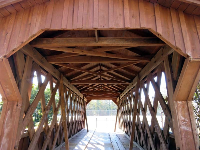 The Salem-Shotwell Covered Bridge was first built by Otto Puls, originally located over Wacoochee Creek on what is now Shotwell Road (CR 252) just north of the community of Salem. This was about 10 miles east of its current location. At that time, the bridge was 76 feet long, constructed using longleaf heart pine, cedar roof shakes, and hand-hewn white oak pegs that joined the latticework, roof trusses, and substructure. The bridge shortened the travel time between the communities of Salem and Shotwell. Occasional repairs were made over the years, along with a restoration of the bridge by the Lee County Commission in 1973, but high water and erosion from various storms had once again taken a toll on the bridge supports. Eventually, the Salem-Shotwell Covered Bridge was closed to motor traffic in 1994 and left to survive the elements.