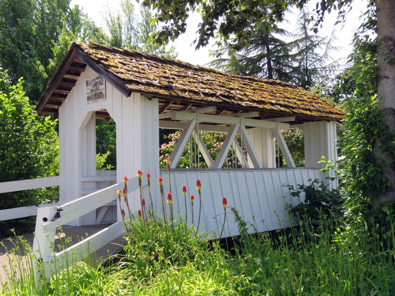 The 1989 Joel Whittemore Covered Bridge is located in Linn County, Oregon. The 20-foot-long pedestrian bridge was constructed by Ben Dahlenburg's high school Building Trades Class students of Sweet Home High School.
