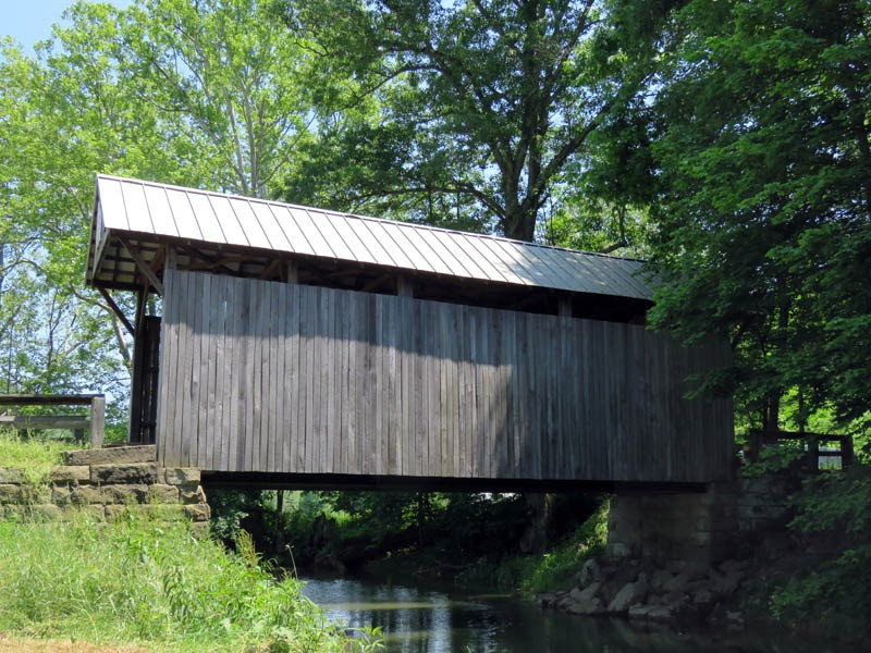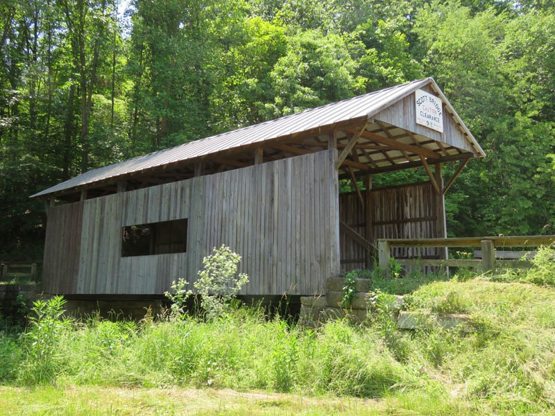 The Scott Covered Bridge was rebuilt in 2008 and reinforced with six steel I-beams. It rests on cut stone abutments.