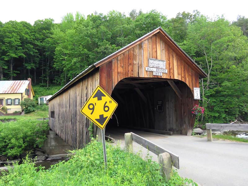 The bridge, also known as the Hayward and Noble Bridge, uses a multiple-kingpost truss. The dam belonging to the mill, a seventy-two-foot structure, still stands upstream. The waters of the First Branch spill over the dam, flow over bedrock, and then pass under the bridge. The bucket of flowers so common to the area stands out front.