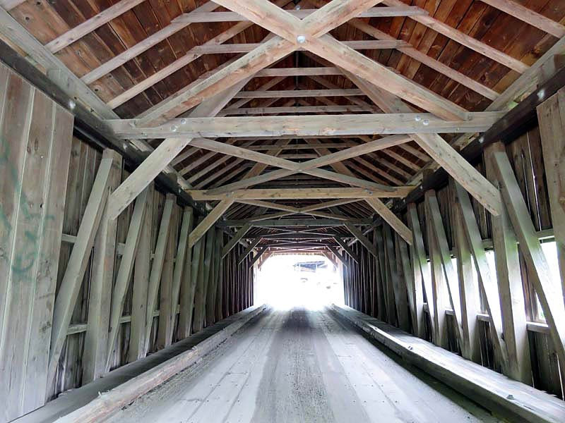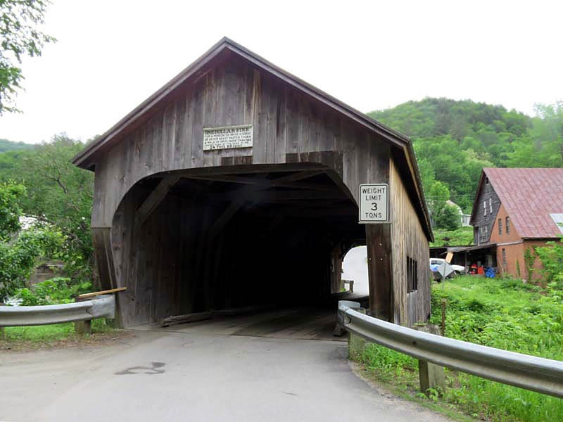 Per the Vermont Journal (Windsor), September 22, 1883, "TUNBRIDGE. - A covered bridge is to replace the one near Hayward & Kibby's mills." In the 1970s, the 1883 bridge was raised to a higher elevation to reduce the risk of flood damage. On March 4, 1999, it was wrenched from its abutments by an ice jam. It was believed the bridge could be rescued from its resting place on top of the ice. Robert Childs, a local construction expert, devised a plan, and the Tunbridge selectmen gave their approval. However, before the necessary materials and equipment could be assembled, the ice shifted, and the remains of the bridge were set afire on March 5, 1999, to protect the downstream covered bridges. The 1883 bridge was built for $532.32, and the new bridge required an expenditure of $230,000. On July 3, 2000, just sixteen months after the structure was lost, the 74-foot-5-inch re-creation was pulled into place the “old-fashioned way” by four teams of oxen.