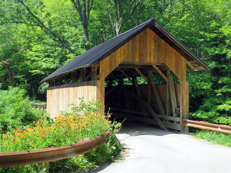 Built by an unknown builder, it is one of three surviving covered bridges in the town of Charlotte, and one of nine in the state with the Burr arch design. Extensive repairs were made in 1949 and again in 1994; the latter repairs were made by Paul Ide and Jan Lewandoski. A new roof was added in 2001.